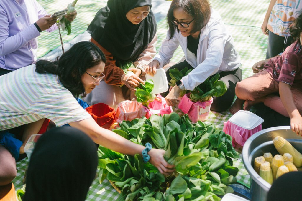 Setelah penjelasan, peserta langsung praktik. Mereka dibagi menjadi kelompok kecil dan duduk melingkar di tikar. Setiap kelompok mendapat satu nyiru berisi jagung dan pakcoy, dilengkapi pisau, sementara tiap peserta memperoleh dua wadah dan dua kain lap. Suasananya ramai namun santai; semua orang terlihat antusias mencoba teknik membungkus sayur yang baru dipelajari. Hasil praktik ini bukan hanya sekadar latihan, tetapi juga menjadi oleh-oleh, setiap peserta membawa pulang sayur yang sudah mereka siapkan lengkap dengan wadah dan kain lapnya.