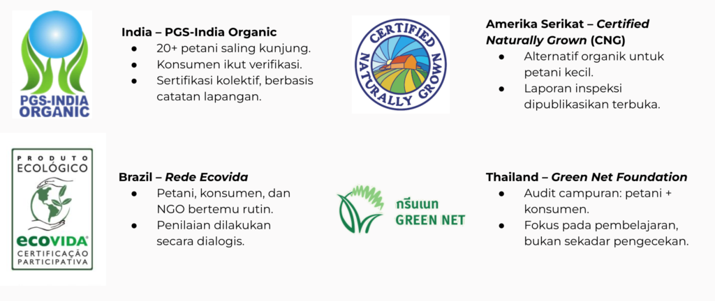 PGS bukan eksperimen baru. Di India, lebih dari 20 petani dalam satu kelompok melakukan kunjungan silang dan melibatkan konsumen dalam proses verifikasi, menghasilkan sertifikasi kolektif berbasis catatan lapangan. Di Amerika Serikat, program Certified Naturally Grown menjadi alternatif organik yang lebih inklusif bagi petani kecil, dengan laporan inspeksi yang terbuka untuk umum. Brazil melalui Rede Ecovida menggabungkan petani, konsumen, dan organisasi pendamping dalam pertemuan rutin untuk mengevaluasi praktik secara dialogis. Thailand dengan Green Net juga menekankan audit kolaboratif antara petani dan konsumen sebagai bagian dari proses belajar.